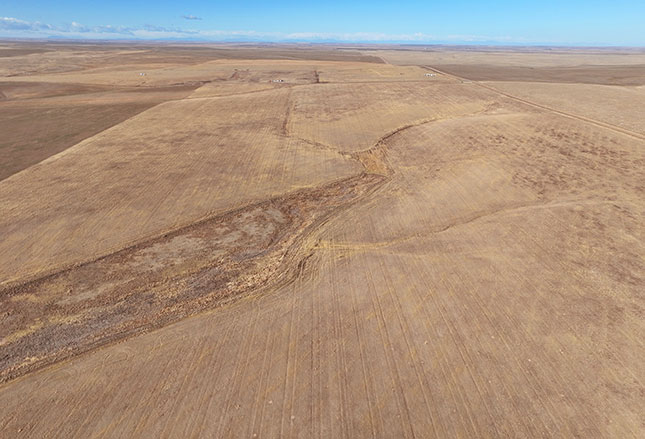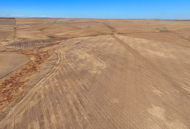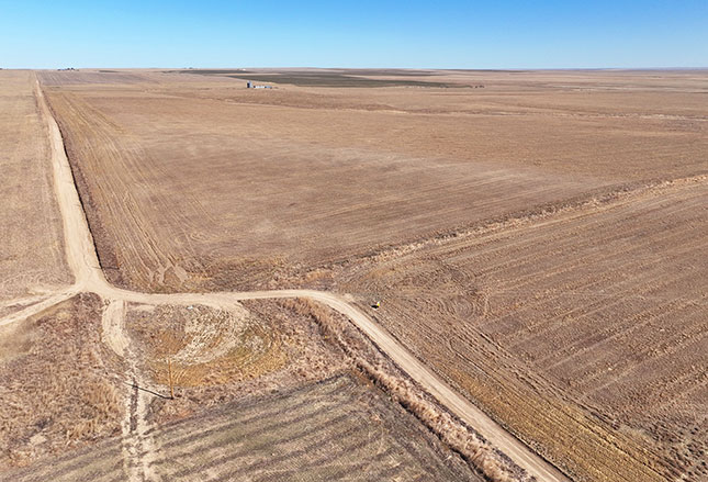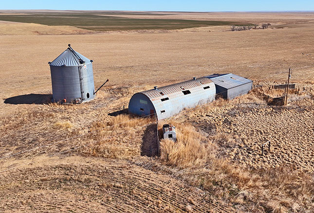 Section 25 - Winter wheat is planted on the north half, with the south half fallow and ready for spring planting. Improvements include a former building site featuring a non functional grain bin and a shop building. A power line extends to the site, offering potential utility access for future improvements. A county road runs the full length of the west boundary, providing dependable access for large equipment. The north draw reportedly presents additional development potential for a water well drilling site.