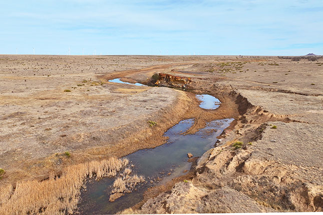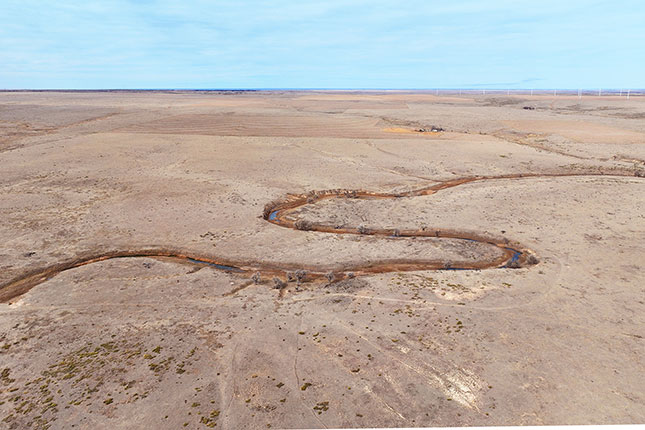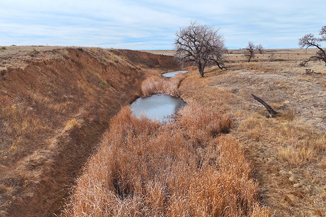 The northern half of the ranch is traversed by 5.2 miles of Two Butte Creek which flows into Two Buttes Reservoir seven miles away. The creek flows intermittently, but the owner reports several live springs and many sub-irrigated areas along with large cottonwood trees. Cattle water along the creek which serves as a magnet for wildlife. Mule deer, antelope and the occasional elk are found on the ranch as well as quail, turkey and waterfowl.